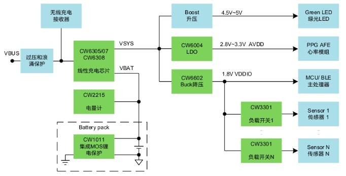 隨著技術(shù)的飛速發(fā)展,智能指環(huán)作為新興智能可穿戴設(shè)備越來越被品牌廠商所關(guān)注。中國穿戴廠商華米在CES 2024期間發(fā)布了名為Helio Ring的智能指環(huán)新品;韓國三星電子于2024年7月正式發(fā)售指環(huán)產(chǎn)品Galaxy Ring,市場反響熱烈。智能指環(huán)既有裝飾潮品的時尚屬性,又是智能手機(jī)的輔助智能感知配件,用于人體健康數(shù)據(jù)的監(jiān)測。相比手表和手環(huán),指環(huán)更貼合皮膚,因此在收集人體基礎(chǔ)生物信息,如脈搏、心率、血氧、心電圖,以及監(jiān)測體溫等方面更有精準(zhǔn)度優(yōu)勢。指環(huán)相比智能手表,還有無感佩戴的特點,更能滿足用戶的差異化需求。智能指環(huán)受限于空間尺寸,配備的鋰電池容量通常在15~23mAh,而續(xù)航時間則需要達(dá)到5天或更久。因此,超低功耗且超小尺寸的芯片必為產(chǎn)品開發(fā)者所青睞。賽微微電(CellWise)已經(jīng)量產(chǎn)多款超低功耗的小尺寸電源芯片,如Figure1所示,都非常適用于智能指環(huán)應(yīng)用。Figure 1.智能指環(huán)電源方案線性充電器-CW6308、CW6305/6307CW6308是一款支持I2C接口和電源路徑管理的線性充電芯片,尺寸為業(yè)內(nèi)最小,充電電流最大支持320mA。在僅有電池供電并開啟Watchdog功能后,芯片工作電流仍低至5μA。CW6308還支持500nA超低功耗模式和300nA船運(yùn)模式,封裝為WLCSP-9,尺寸為1.24mm*1.24mm。CW6305/6307功能與CW6308一致,區(qū)別是可支持最大470mA充電電流,芯片封裝尺寸為WLCSP-9,1.55mm*1.55mm。電量計-CW2215單節(jié)鋰電池電量計CW2215的工作電流僅為5μA,是業(yè)內(nèi)最低,內(nèi)置高精度ADC,支持電壓、電流和溫度監(jiān)測。芯片內(nèi)置“FastCali”算法,結(jié)合對客戶電池樣品建模測試提取的電池特征參數(shù),可完成對電池剩余電量(SOC)、循環(huán)數(shù)(Cycle)和電池健康(SOH)的精確計算,并可配置對低電量、高溫或低溫的情況進(jìn)行中斷上報。CW2215為WLCSP-9封裝,尺寸為1.58mm*1.53mm。LDO低壓差穩(wěn)壓器-CW6004CW6004是一款超低功耗LDO,靜態(tài)工作電流低至300nA。其輸入電壓1.6V~5.5V,輸出電壓有1.1V, 1.2V, 1.5V, 1.8V, 2.5V, 2.8V, 3.0V和3.3V可選,輸出電流為200mA。CW6004具有快速的動態(tài)響應(yīng)特性,當(dāng)設(shè)備從Standby輕載快速切換到Active重載的工作場景下,VOUT輸出電壓也能保持穩(wěn)定。該芯片為DFN-4封裝,尺寸為1.0mm*1.0mm。Figure 2.  CW6004靜態(tài)電流vs輸入電壓Figure 3.  CW6004 Ground電流vs 輸出電流Buck降壓轉(zhuǎn)換器-CW6602、CW6603CW6602是一款超低功耗Buck降壓轉(zhuǎn)換器,輸入電壓為2.15V~5.5V,輸出電壓為1.2V~3.3V共8檔可選。其靜態(tài)工作電流低至330nA,負(fù)載電流能力為0.6A/峰值電流1.0A。在1.8V輸出電壓時,芯片的重載效率達(dá)90%以上,100uA輕載的效率也可達(dá)85%。該芯片具有快速的負(fù)載動態(tài)響應(yīng)能力,封裝為WLCSP-8,尺寸為1.575mm*0.825mm。CW6603的功能和尺寸與CW6602一致,區(qū)別是輸出電壓范圍為0.6V~1.2V。Figure 4.CW6602 Vout=1.8V的轉(zhuǎn)換效率負(fù)載開關(guān)-CW3301CW3301是一款超低MOS導(dǎo)通電阻的負(fù)載開關(guān),輸入電壓為1.1V~5.5V,最大通流能力2.0A。芯片的輸出電壓擺率(slew-rate)受控,有效保護(hù)后級芯片;CW3301具有業(yè)內(nèi)領(lǐng)先的5nA On-State靜態(tài)工作電流和12nA Off-state漏電流,并支持輸出快速放電可選;其封裝為WLCSP-4,尺寸為0.76mm*0.76mm。鋰電保護(hù)-CW1011CW1011為單節(jié)鋰電池保護(hù)芯片,支持高精度過壓、欠壓、充電過流、放電過流和短路保護(hù)。芯片內(nèi)部集成了54mΩ導(dǎo)通電阻的Dual MOSFETs;其靜態(tài)工作電流為2.5μA,并支持休眠模式,功耗低至20nA。CW1011的封裝為DFN-6,尺寸為2.0mm*1.5mm。賽微微電(CellWise)深耕超低功耗電源技術(shù)多年,在智能手表、TWS耳機(jī)、主動手寫筆、無線藍(lán)牙鍵鼠等可穿戴設(shè)備和數(shù)碼配件上擁有眾多design wins。今天介紹的這些電源芯片,一定也可以助力各品牌廠商和方案開發(fā)者,實現(xiàn)智能指環(huán)的更小空間堆疊、更長電池續(xù)航和更優(yōu)用戶體驗。感謝大家對賽微微電公司和產(chǎn)品的持續(xù)關(guān)注。